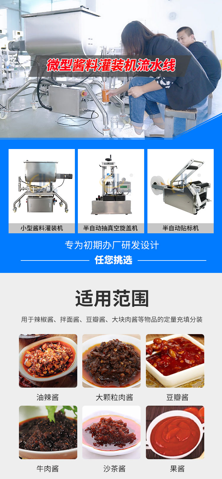 小型醬料灌裝生產線又名醬料灌裝三劍客,由半自動醬料灌裝機+半自動真空旋蓋機+半自動圓瓶貼標機組合而成。該灌裝機適用于辣椒醬、豆瓣醬、大塊肉醬等物品的定量充填分裝。